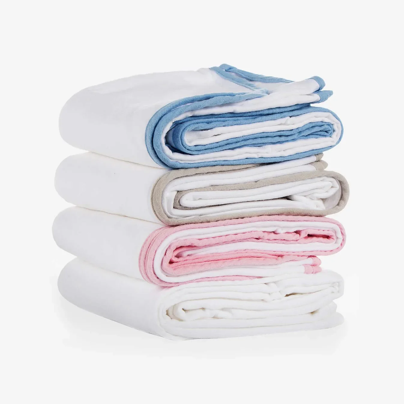 Pros: They’re a 48-inch square, nice and big to get a tight fit but not feel like you’re running out of fabric. They’re made of a lightweight cotton flannel that grips extremely well, preventing particularly Houdini-esque babies from easily escaping. The fabric also offers a layer of warmth in colder months.
